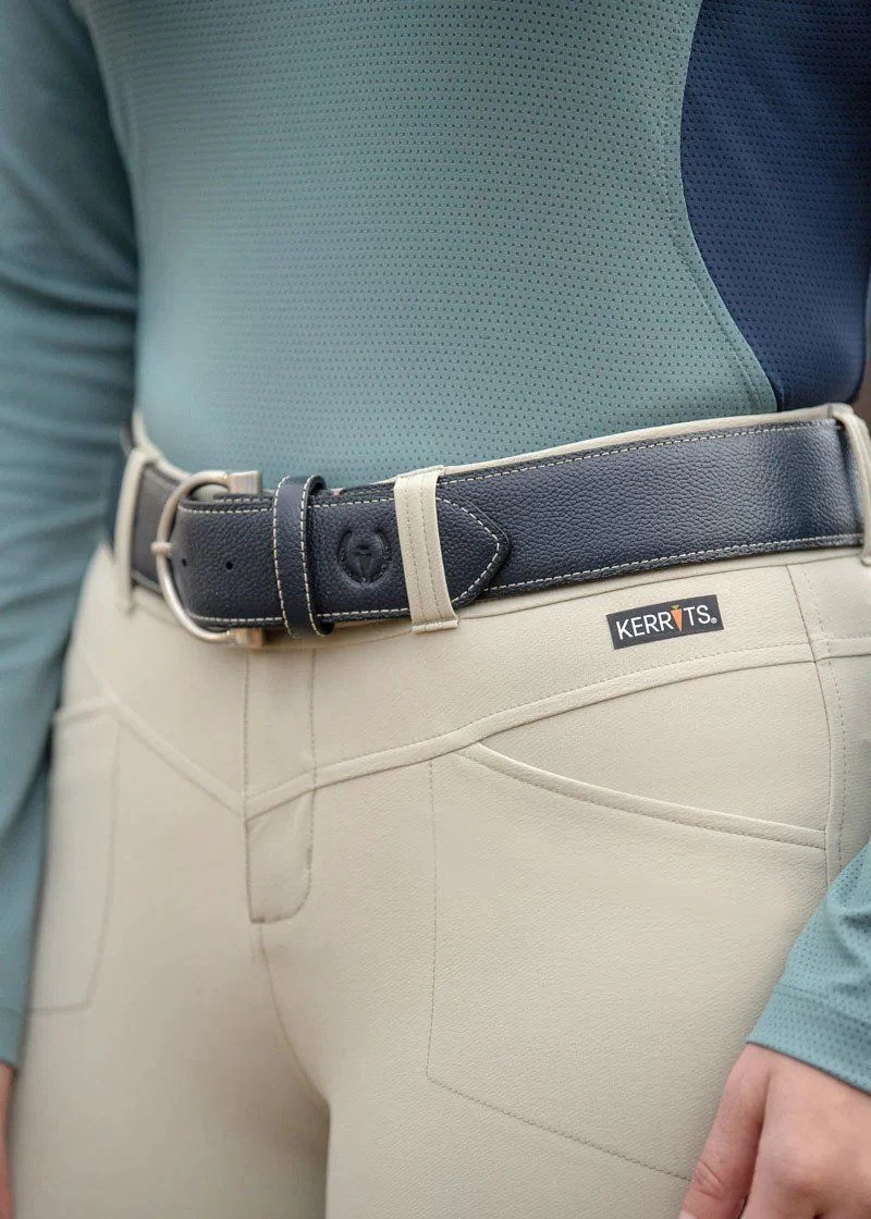 This pebbled leather belt will complete any ensemble and provide a secure fit in saddle. Soft and supple, the one and three-quarter inch wide leather has a contoured shape to work perfectly with Kerrits breeches. Tying together an equestrian look has never been easier!