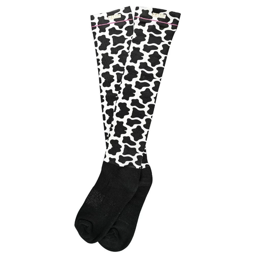 Lettia Cow Print Padded Boot Socks are stylish and comfortable socks designed for equestrian enthusiasts or anyone who enjoys outdoor activities. These socks feature a unique black and white cow print design that is both fun and functional. The socks are made from a blend of materials that include cotton, nylon, and spandex, which provide a soft and stretchy feel, ensuring a snug fit that won’t slip down. These boot socks have a tall length that extends over the calf and up to the knee, providing ample coverage and protection against rubbing and chafing from boots or other footwear.